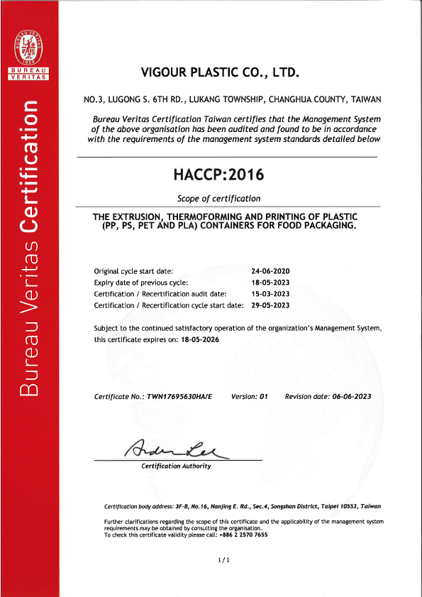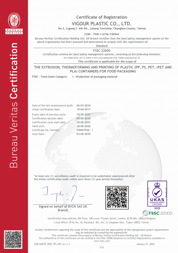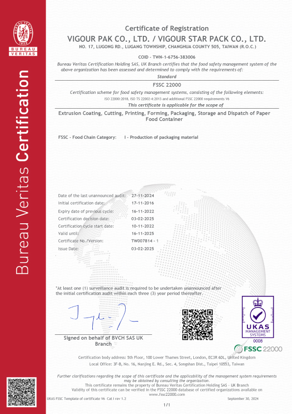 國際認證 為了提供各種訂製需求的包裝解決方案,我們的生產和品質基準通過ISO-22000和HACCP安全衛生管理作業系統認證,也獲得FSSC-22000食品安全認證及BRC認證。 VG的原料均通過美國FDA認可以及食品級認證,來自領先的整合性原紙類供應商,並妥善維護水源及森林的生態,認真的復育、美化和保持大自然資源,為了子孫後代的健康和福利著想,善盡維護地球環境的責任及義務。 FSSC-22000 FSSC-22000 HACCP BPI 鄧白氏中小企業菁英獎